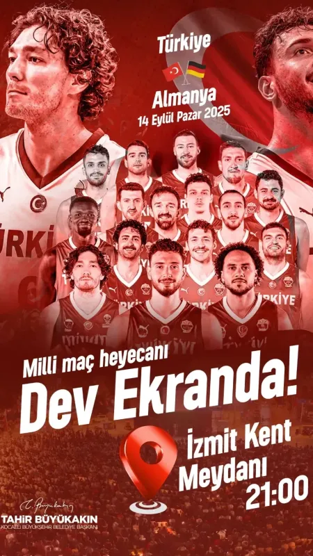 EuroBasket 2025 heyecanı Kocaeli’de doruğa çıkıyor. Yarı finalde Yunanistan’ı 94-68 mağlup ederek finale yükselen 12 Dev Adam, Almanya engelini de geçerek Avrupa şampiyonluğu hedefliyor. İzmit Kent Meydanı’nda kurulacak dev ekranda binlerce vatandaş bu tarihi ana tanıklık edecek.