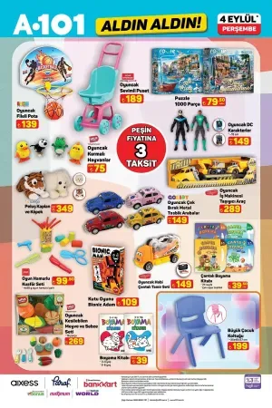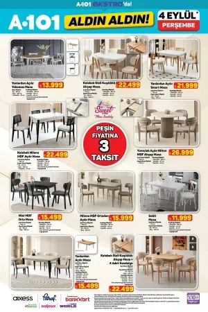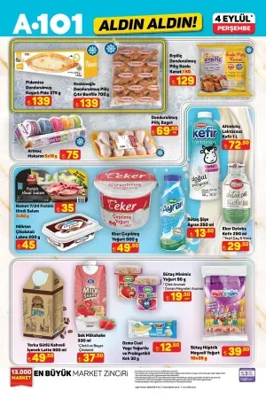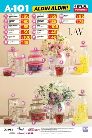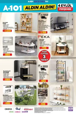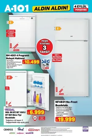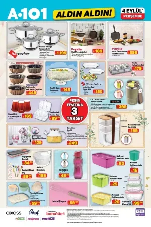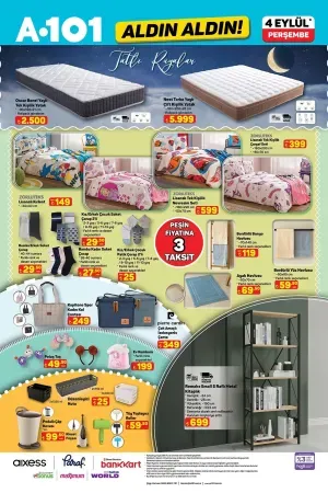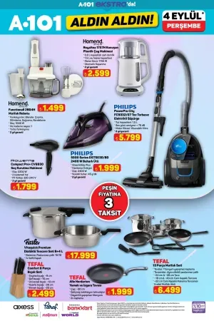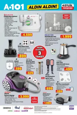 Yepyeni ürünlerle dikkat çeken A101 4 Eylül kataloğu, hem ev ihtiyaçlarını karşılayacak hem de cazip fiyat avantajlarıyla bütçe dostu alışveriş imkânı sunacak. Elektrikli ev aletleri, TV modelleri, züccaciye ürünleri, tekstil ve gıda ürünleri perşembe gününden itibaren raflarda alıcılarını bekliyor.