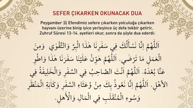 “Bismillah! Allah’ım! Sen seferde arkadaşım, ailemde vekilîmsin. Allah’ım, yeryüzünü bize hizmet ettir, yolculuğumuzu kolaylaştır. Allah’ım, yolun zorluklarından, üzüntülü bir şekilde eve dönmekten, malımızda ve ailemizde meydana gelebilecek kötülüklerden sana sığınıyorum.”