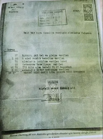Damga pulları yapıştırılmış, Cumhurbaşkanı Gazi Mustafa Kemal Atatürk’e gönderilecek faturada, ne için ne harcama yapıldığı Niğdeli manav Durmuş Ali tarafından tek tek belirtilmiş. Daktilo ile yazılan faturada yapılan bir hata, Durmuş’un adının Durmış olarak yazılmasıydı.