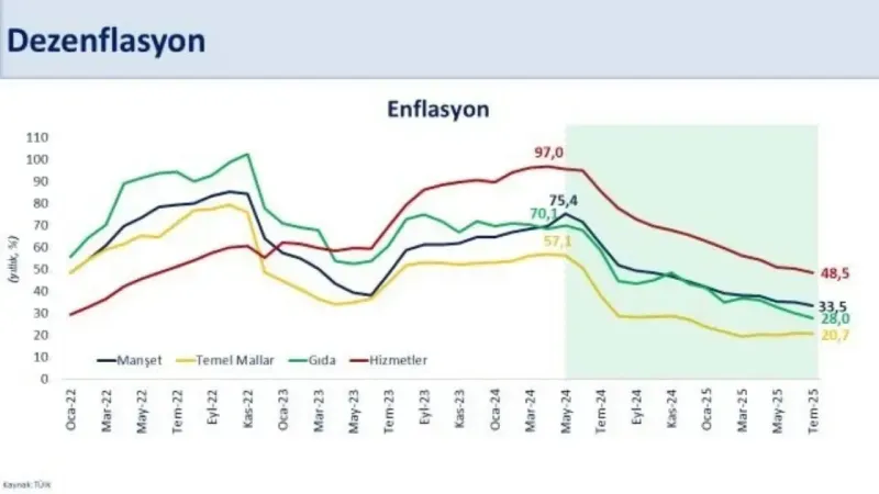 "Enflasyon 44 ayın en düşük seviyesinde. Aylık enflasyon temmuzda geçici ve dönemsel etkilerle yüzde 2,06 gerçekleşirken yıllık enflasyon son 12 ayda 28,3 puan düşüşle yüzde 33,5’e geriledi. Yıllık gıda enflasyonu yüzde 28, temel mal enflasyonu yüzde 20,7 oldu. Hizmet enflasyonu üç yılı aşkın sürenin ardından ilk kez yüzde 50’nin altına indi. Dezenflasyon süreci hedeflerimiz doğrultusunda ilerlemektedir. Yıl sonunda enflasyonun TCMB’nin tahmin aralığında gerçekleşeceğini öngörüyoruz. Enflasyondaki düşüş, öngörülebilirliği artırarak yurtiçi finansal şartların ve yatırım ortamının daha da iyileşmesine katkı sağlayacaktır. Temel önceliğimiz olan kalıcı fiyat istikrarını sağlamak için programımızı kararlılıkla uygulamaya devam edeceğiz."