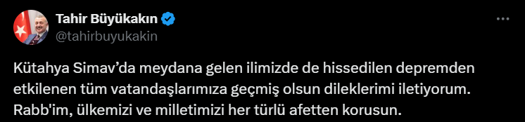 "Kütahya Simav’da meydana gelen ilimizde de hissedilen depremden etkilenen tüm vatandaşlarımıza geçmiş olsun dileklerimi iletiyorum. Rabb’im, ülkemizi ve milletimizi her türlü afetten korusun."