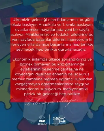 CHP Kocaeli İl Başkanı Bülent Sarı bugün uyum eğitimine başlayan okul öncesi ve 1. sınıf öğrencileri için bir mesaj yayınladı. Başkan Sarı açıklamasında "Ülkemizin geleceği olan fidanlarımız bugün okula başlıyor. Anaokulu ve 1. sınıfa başlayan evlatlarımızın hayatlarında yeni bir sayfa açılıyor. Miniklerimize ve fedakâr ailelerine bu yeni sayfada başarılar dilerim. İnanıyorum ki ilerleyen yıllarda nice başarılarına hep birlikte sevinecek, hep birlikte gururlanacağız.