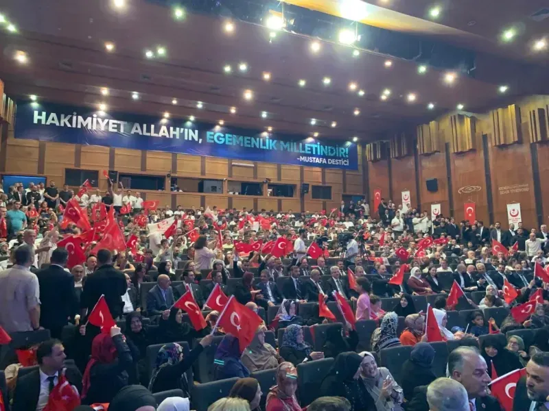 Salonun en arkasına asılan devasa pankartta Genel Başkan Mustafa Destici'nin imzasını taşıyan ''Hakimiyet Allah'ın, egemenlik milletindir!'' sözü yer aldı.