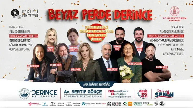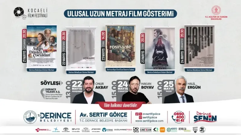 “Kültür ve Turizm Bakanlığı’nın katkılarıyla düzenlenecek olan Kocaeli Film Festivali, Türk sinemasının yıldız isimleri ile birbirinden özel filmleri kent halkı ile buluşturacak. Sinemanın kalbinin Derince’de atacağı beş günlük etkinlikler kısa ve uzun metraj film gösterimleri ve söyleşiler ile renklenirken, ödül töreni ile sona erecek.