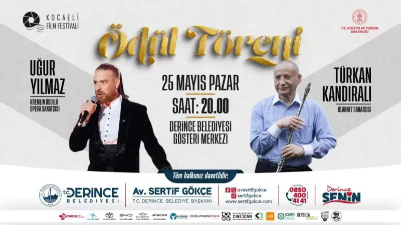 Kısa ve uzun metrajlı film gösterimlerinin yanı sıra söyleşilerin yer aldığı Kocaeli Film Festivali 25 Mayıs Pazar günü Derince Belediyesi Gösteri Merkezi’nde düzenlenecek olan ödül töreni ile sona erecek. Kremlin Ödüllü Opera Sanatçısı Uğur Yılmaz ve ünlü klarnet sanatçısı Türkan Kandıralı’nın da sahne alacağı ödül töreni 25 Mayıs Pazar akşamı saat 20.00’de başlayacak. Derince Belediye Başkanı Av. Sertif Gökçe de beş gün boyunca sanatın kalbinin Derince’de atacağını belirterek tüm kent halkını ve sinemaseverleri etkinlikleri takip etmek üzere ilçeye davet etti.”