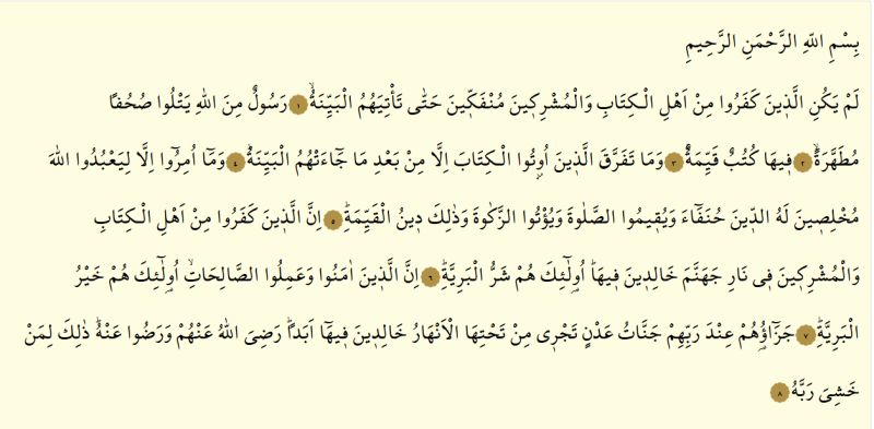 لَمْ يَكُنِ الَّذِينَ كَفَرُوا مِنْ أَهْلِ الْكِتَابِ وَالْمُشْرِكِينَ... (8 ayet)
