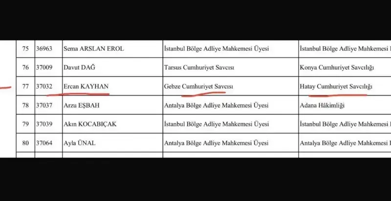 Hayatını kaybeden Cumhuriyet Savcısı Ercan Kayhan’ın, uzun yıllar Çorum ve Gebze Adliyelerinde görev yaptığı, en son olarak da Haziran ayına kadar Kocaeli Gebze Adliyesi’nde bulunduğu öğrenildi. Hâkimler ve Savcılar Kurulu’nun 20 Haziran 2025 tarihli yaz kararnamesiyle Hatay’a atanmış, ancak bu atamaya itiraz etmişti. HSK, itirazı kabul ederek Kayhan’ı İstanbul Çağlayan Adliyesi’nde yeniden görevlendirmişti.