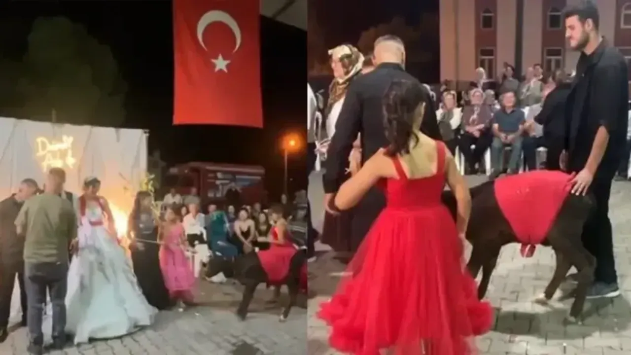 Damat Ramazan Karadağ’a eniştesi Birol Günay tarafından düğünde buzağı hediye edildi. Altın, bilezik, para derken hediye listesine buzağı da eklenince davetliler büyük şaşkınlık yaşadı. Gelin ve damat, bu ilginç hediye karşısında hem kahkaha attı hem de mutluluklarını gizleyemedi.