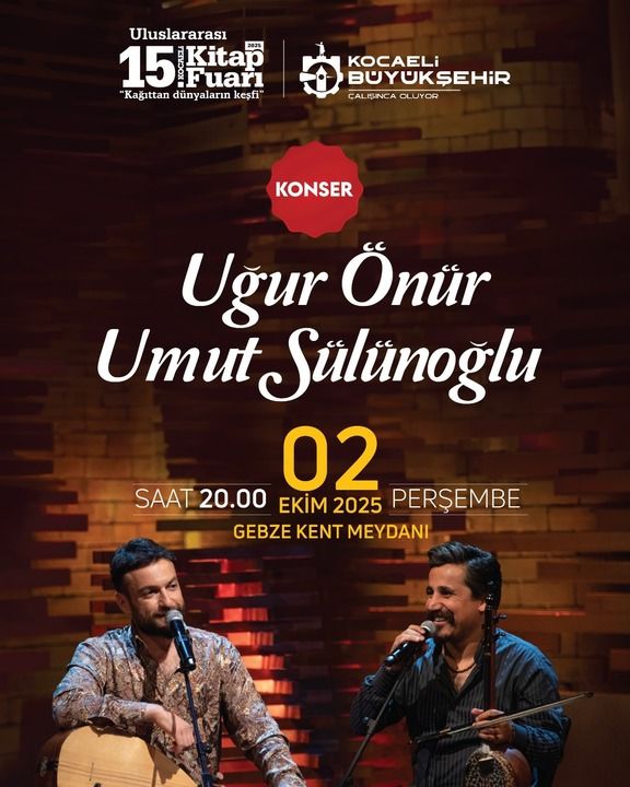 Milyonların beklediği 15. Kitap Fuarı, 4 Ekim Cumartesi günü kapılarını açıyor. Kocaeli Büyükşehir Belediyesi tarafından dev fuar öncesi İzmit ve Gebze'de birçok etkinlik gerçekleştiriliyor. Fuar öncesi 02 Ekim Perşembe akşamı (bugün) saat 20.00’de Gebze Kent Meydanı’nda düzenlenmesi planlanan “Uğur Önür ve Umut Sülünoğlu” konseri, organizasyonel nedenlerden dolayı ileri bir tarihe ertelendi.