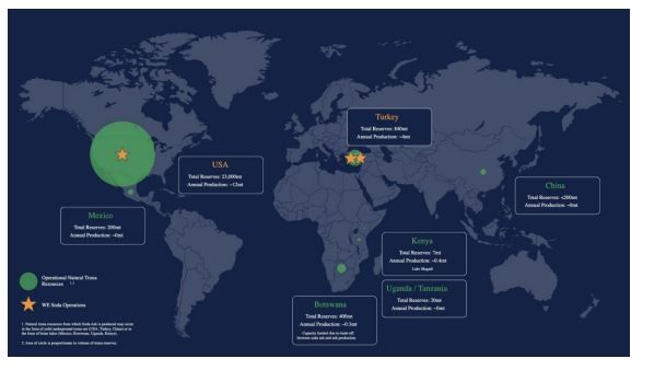 ⦁ Hammadde olarak sodyum madenciliği, ton başına önemli ölçüde daha düşük maliyetlerle daha uygun maliyetli bir süreçtir.