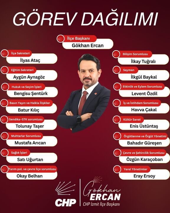 Cumhuriyet Halk Partisi( CHP) İzmit İlçe Örgütü seçimlerinde tek aday olarak girdiği kongrede yeniden başkan seçilen ve ikinci dönemine başlayan İlçe Başkanı Gökhan Ercan, yönetim kurulunda görev dağılımını da gerçekleştirdi. Ercan'ın önceki dönem yönetiminde de yer alan İlkgül Baykal, Bengisu Şentürk ve İlkay Tuğralı, yönetimde yine aynı görevlerine devam etti. Yeni dönem yöneticilerinin görev dağılımı da gerçekleştirildi.