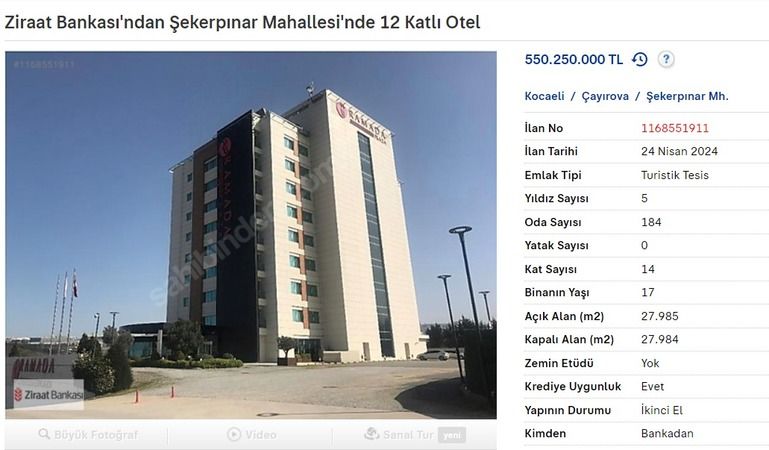 Devlet bankası olan Ziraat’in mülkiyetinde, Kocaeli Çayırova’da olan bir otel var.