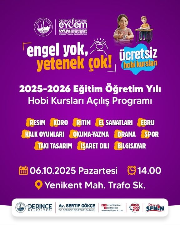 Bu güzel Hobi Kursları Açılış Programıyla başlayacak olan 2025-2026 Eğitim- Öğretim Yılının başta değerli kurs öğretmenlerimiz, kursiyerlerimiz ve kıymetli aileleri olmak üzere tüm EYDEM ailesine hayırlı ve uğurlu olmasını dilerim. Nazik davetleri için Sosyal Destek Hizmetleri Müdürü Sayın Özcan ÖZER’e çok teşekkür eder, böylesine yüreklere dokunan işlere imza attıkları için Derince Belediye Başkanı Sayın Av. Sertif GÖKÇE ve ekibini kutlar, bu güzel hizmetlerinin devamını dilerim.