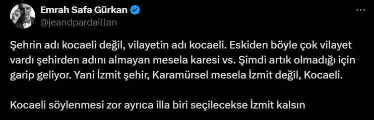 Bir kullanıcı, İzmit isminin kaldırılması gerektiğini savunarak, “Kocaeli neyinize yetmiyor, İzmir’le karışıyor, bir şehrin neden iki adı var?” ifadelerini kullandı. Bu paylaşıma yanıt veren Emrah Safa Gürkan, tartışmayı tarihsel çerçevede ele aldı.