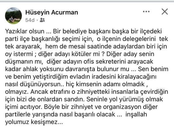 Sen benim ve benim yetiştirdiğim evladın iradesini kiralayacağını nasıl düşünüyorsun.. hiç kimsenin adamı olmadık , olmayız. Ancak etrafını o zihniyetteki insanlarla çevirdiğin için bizi de onlardan sandın. Seninle yol yürümüş olmak içimi acıtıyor. Böyle bir zihniyet ve organizasyon diğer partilerle yarışında nasıl başarılı olacak. inşallah yolumuz kesişmez."