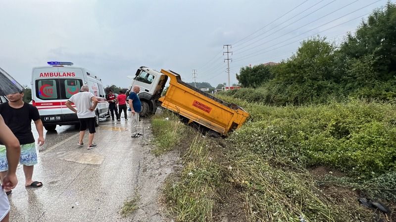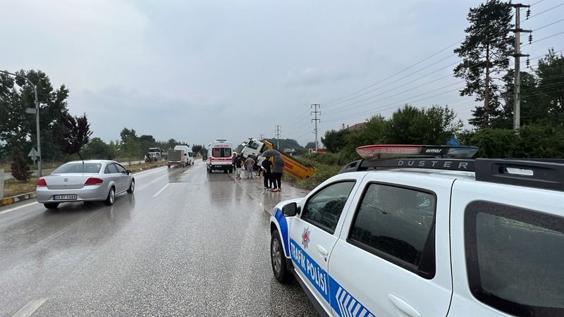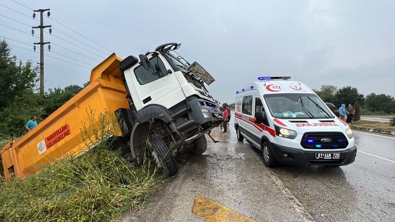 Kaza D-100 Karayolu Hacıkadirler kavşağında meydana geldi. Düzce’den Kocaeli istikametine seyir halinde olan F.S. idaresindeki 81 ABP 730 plakalı Mercedes marka Karayollarına ait kamyon, kavşak içerisinde sağanak yağış ile birlikte kayganlaşan yolda sürücüsünün direksiyon hakimiyetini kaybetmesi ile kanala uçtu. Kazayı görenlerin ihbarı ile olay yerine sağlık, polis ve itfaiye ekipleri sevk edildi. Sıkışan sürücüyü Düzce Belediyesi İtfaiye Müdürlüğü ekipleri çıkartırak sağlık ekiplerine teslim etti. Olay yerinde yapılan ilk müdahalenin ardından F. S. Düzce Devlet Hastanesi Acil Servisine kaldırılarak tedavi altına alındı. Kaza ile ilgili inceleme başlatıldı.
