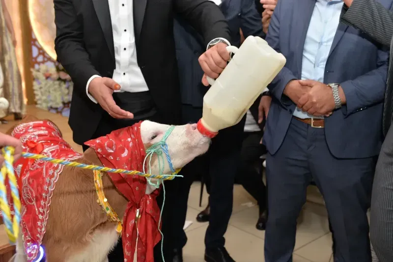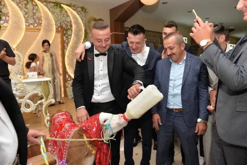 Kent merkezinde ikamet eden Saliha Yaman ve Musa Yaman çifti, düzenlenen düğün töreniyle dünyaevine girdi. Damat Musa Yaman'ın dayısı Gazi Salih Dıkkıloğlu ile kuzeni Emrah Dıkkıloğlu, takı töreninde çifte 3 aylık simental ırkı buzağı hediye etti. Gelin Saliha ve Damat Musa Yaman, kendilerine düğün hediyesi olarak verilen buzağıyı biberonla besleyerek süt içirdi.