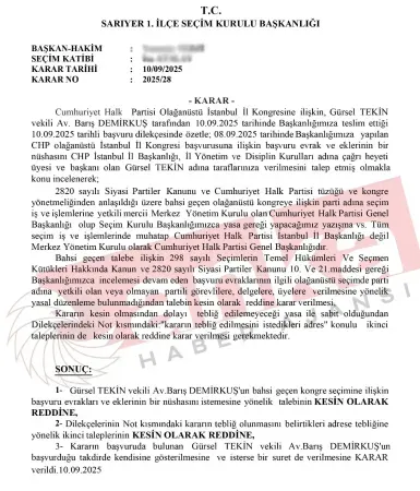 CHP'de İstanbul Kongresi'nin iptali ve kayyum atanmasının ardından hareketli günler yaşanırken dikkat çeken bir karar Sarıyer İlçe Seçim Kurulu'ndan geldi. İstanbul 45. Asliye Hukuk Mahkemesi'nce CHP İstanbul İl Yönetimi'ne görevlendirilen Gürsel Tekin, İl Kongresi düzenlemek için Sarıyer İlçe Seçim Kuruluna başvurduğu iddialarını yalanlayarak, karar defterinin tasdiki dışında İlçe Seçim Kurulu'na herhangi bir başvuruda bulunmadıklarını söyledi. Kararın belgesi ortaya çıktı.