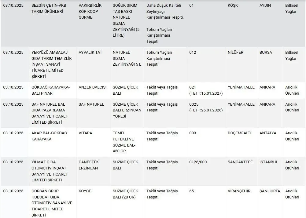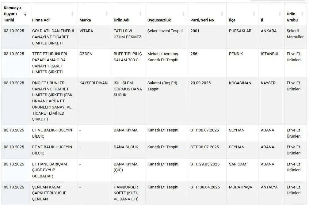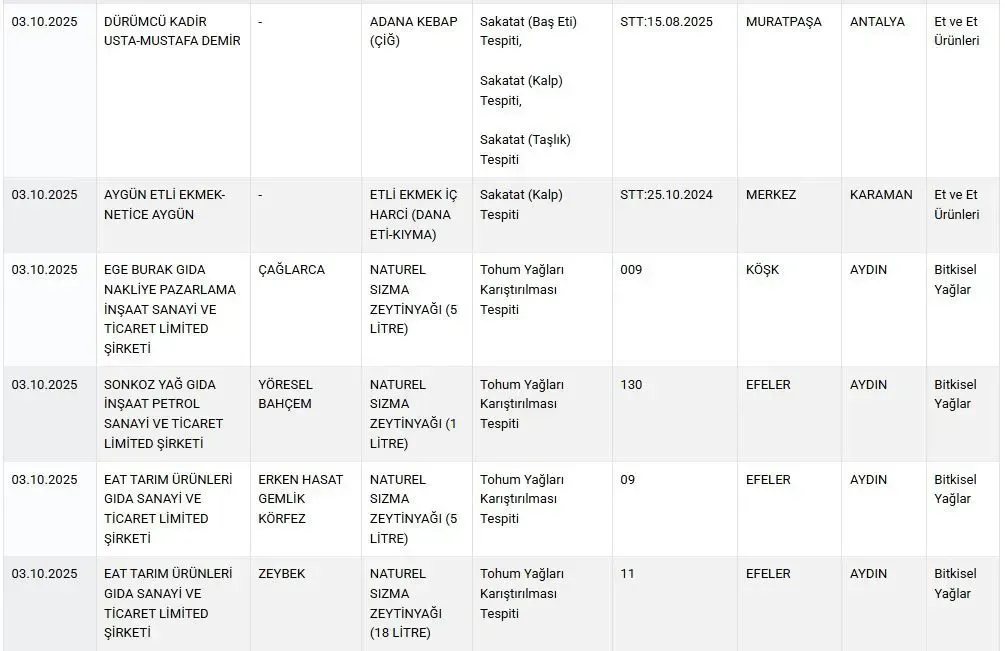 Vatandaşların sağlıklı gıdaya erişmesi için Tarım ve Orman Bakanlığı yaptığı denetimler sonrası uygunsuz olan ürünleri ifşa etmeye devam ediyor.Zaman zaman güncellenen ve yenileri eklenen uygunsuz ürünler listesine yeni markalar ve ürünler girdi.Son yapılan testlerde; dana kıyma ve sucukta kanatlı eti, Adana kebapta kalp ve baş eti kullanımı, ayrıca zeytinyağı yapımında çeşitli usulsüzlükler tespit edildi.