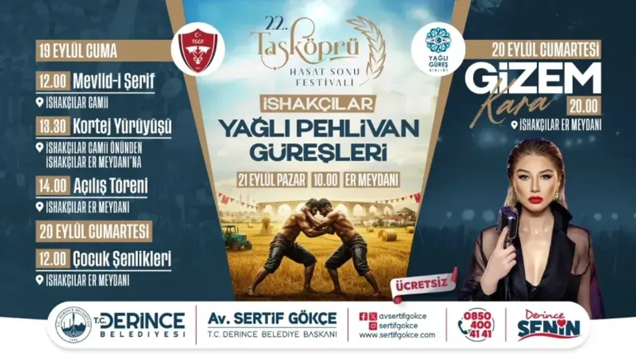 Toprağın bereketi, emeğin alın teri ve kültürümüzün derin kökleri bu yıl yine İshakçılar'da düzenlenecek olan festivalde hayat buluyor. Derince Belediyesi'nin ev sahipliğinde üç gün boyunca sürecek olan Taşköprü Hasat Sonu Festivali ve İshakçılar Yağlı Pehlivan Güreşleri, birlik ve dayanışma içinde geçen büyük bir şölene dönüşecek. Bu yıl yine mevlid-i şerif, kortej yürüyüşü, konser, çocuk eğlenceleri, yöresel ürün satışları ve pehlivanların katılımıyla binlerce kişiye ev sahipliği yapacak olan İshakçılar'daki etkinlikler 19-20-21 Eylül tarihleri arasında gerçekleşecek.