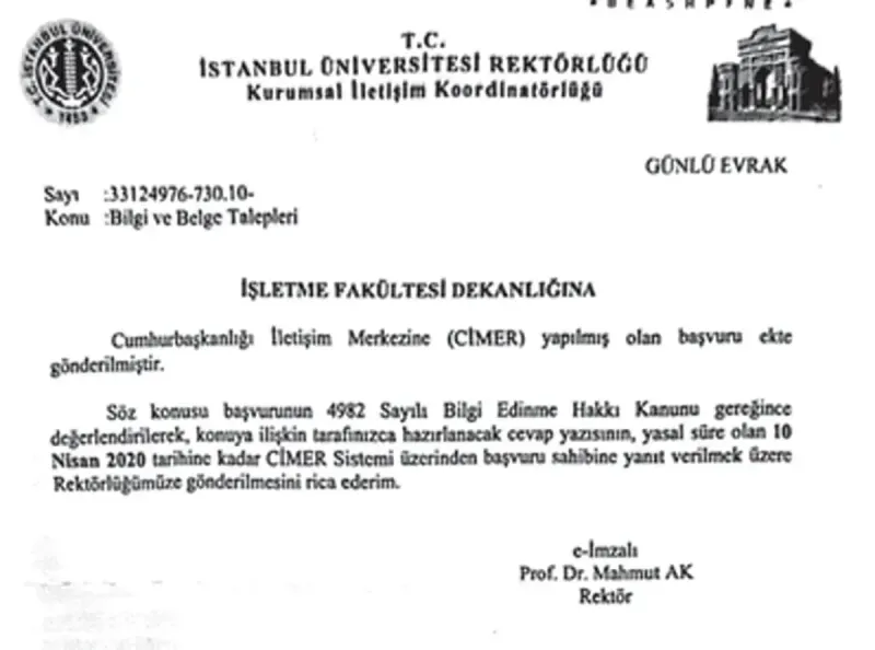 CİMER, iddia konusunun araştırılması için diplomanın verildiği İstanbul Üniversitesi Rektörlüğü'ne 24 Mart 2020 tarih ve 65946 sayı ile gönderdi. Rektör Prof. Dr. Mahmut Ak, İmamoğlu'nun mezun olduğu İşletme Fakültesi Dekanlığı'na aynı gün şu yazıyı gönderdi: