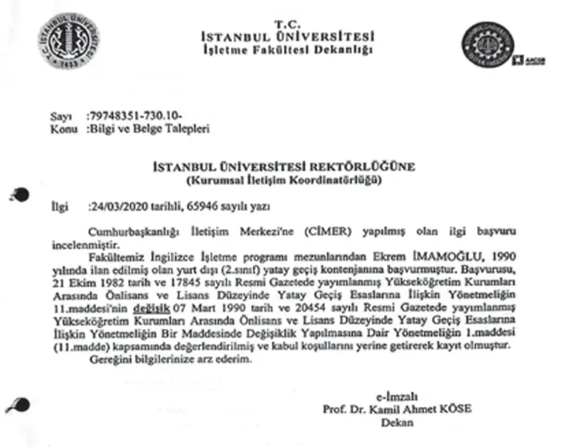 "Cumhurbaşkanlığı İletişim Merkezi'ne (CİMER) yapılmış olan ilgili başvuru incelenmiştir. Fakültemiz İngilizce İşletme programı mezunlarından Ekrem İmamoğlu, 1990 yılında ilan edilmiş olan yurtdışı (2.sınıf) yatay geçiş kontenjanına başvurmuştur. Başvurusu, 21 Ekim 1982 tarih ve 17845 sayılı Resmi Gazetede yayımlanmış Yükseköğretim Kurumları Arasında Önlisans ve Lisans Düzeyinde Yatay Geçiş Esaslarına İlişkin Yönetmeliğin II. maddesinin değişik 7 Mart 1990 tarih ve 20454 sayılı Resmi Gazetede yayımlanmış Yükseköğretim Kurumları Arasında Önlisans ve Lisans Düzeyinde Yatay Geçiş Esaslarına İlişkin Yönetmeliğin Bir Maddesinde Değişiklik Yapılmasına Dair Yönetmeliğin 1.maddesi (11.madde) kapsamında değerlendirilmiş ve kabul koşullarını yerine getirerek kayıt olmuştur.