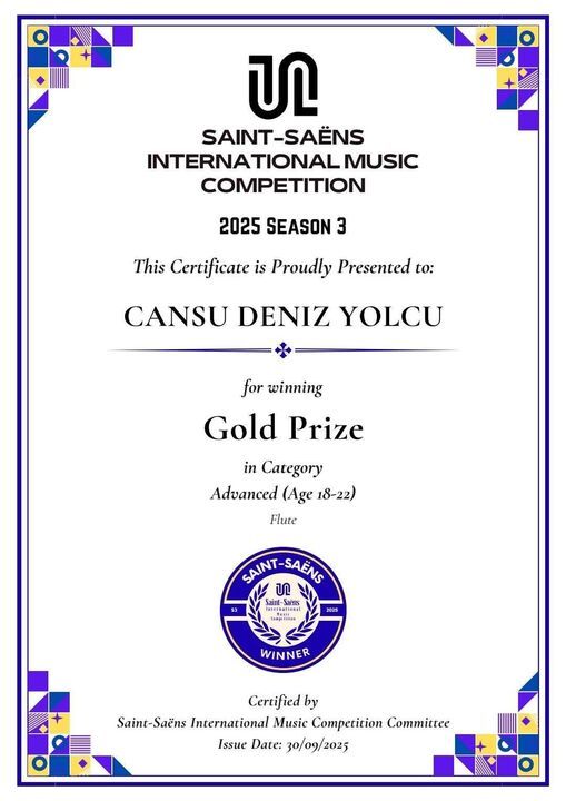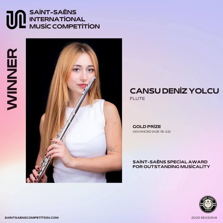 İzmitli genç flüt sanatçısı Cansu Deniz Yolcu, İngiltere’de düzenlenen 2025 Saint-Saëns Uluslararası Müzik Yarışması’nda 18-22 yaş kategorisinde “Gold Prize” kazanarak dünya birinciliğine ulaştı. Paris, Lozan ve Seul gibi dünyaca ünlü konservatuvarlardan yarışmaya katılan finalistleri geride bırakan Yolcu, bu büyük başarısıyla hem Türkiye’yi hem de memleketi Kocaeli’yi gururlandırdı.
