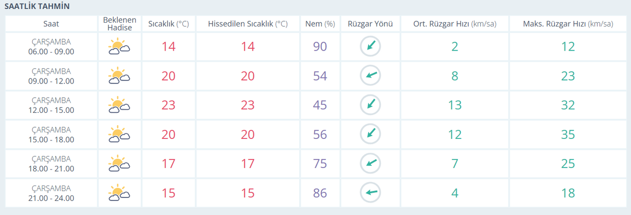 09.00-12.00 saatleri arasında sıcaklık 20°C’ye çıkacak, nem yüzde 54’e düşecek ve rüzgar saatte 8 km hızla esecek. 12.00-15.00 saatlerinde sıcaklık en yüksek 23°C’ye ulaşacak, rüzgar saatte 13 km’ye kadar güçlenecek. 15.00-18.00 saatlerinde hava parçalı bulutlu kalacak, sıcaklık 20°C civarında seyredecek ve rüzgar ortalama 12 km hızla esecek. 18.00-21.00 saatlerinde sıcaklık 17°C’ye düşecek, nem yüzde 75 civarında olacak ve rüzgar hızı 7 km/sa’ye gerileyecek. 21.00-24.00 arasında sıcaklık 15°C olacak, nem yüzde 86’ya çıkacak ve rüzgar 4 km/sa hıza düşecek. Gün boyu yağış beklenmiyor, vatandaşların hafif kıyafetlerle dışarı çıkması uygun olacak.