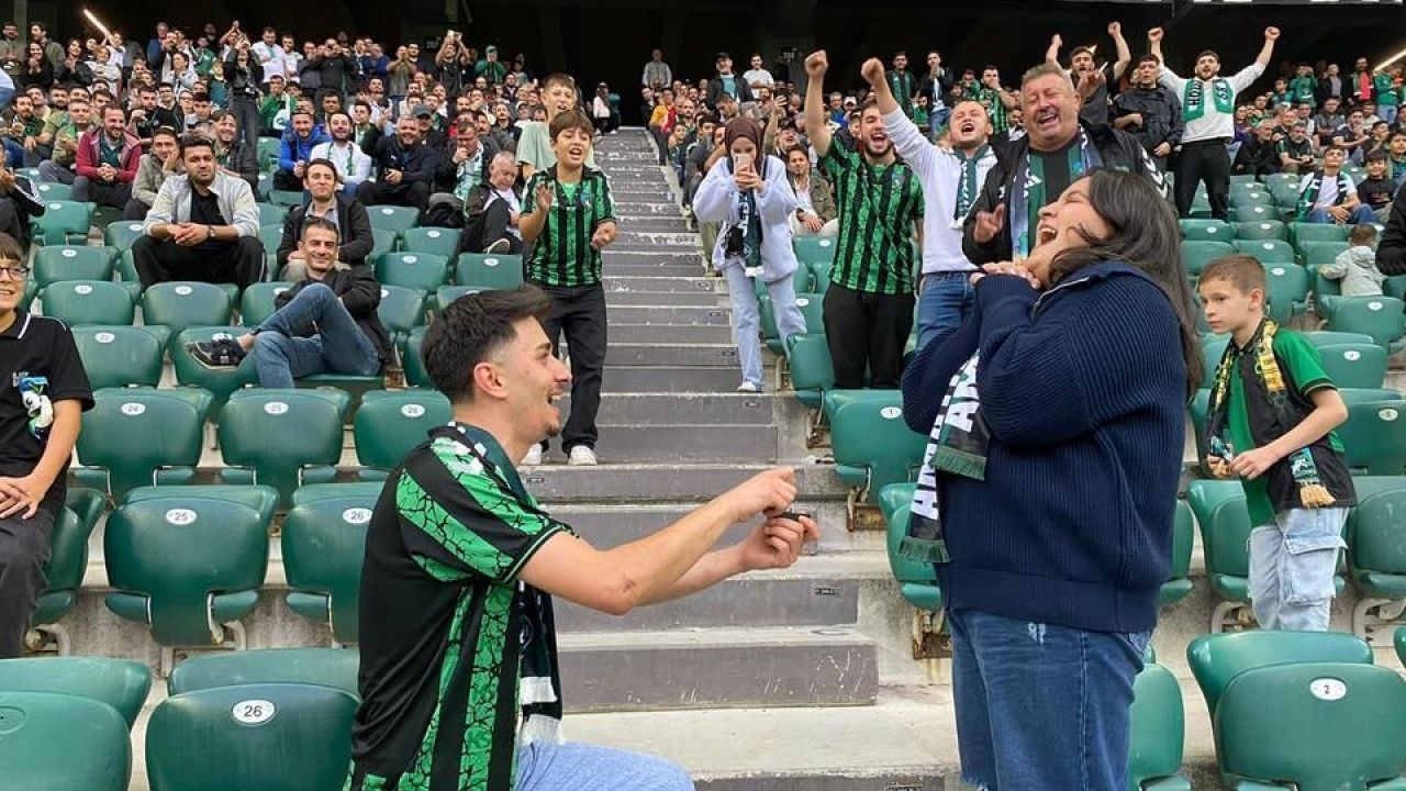 Hazırlanan teklif, çevredeki taraftarların dikkatini çekti. Betül’ün teklifi kabul etmesiyle birlikte binlerce kişi çifti alkışlarla tebrik etti. O anlar tribünde bulunan birçok kişi tarafından cep telefonuyla kaydedildi.