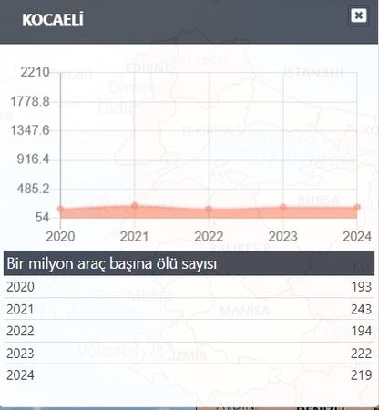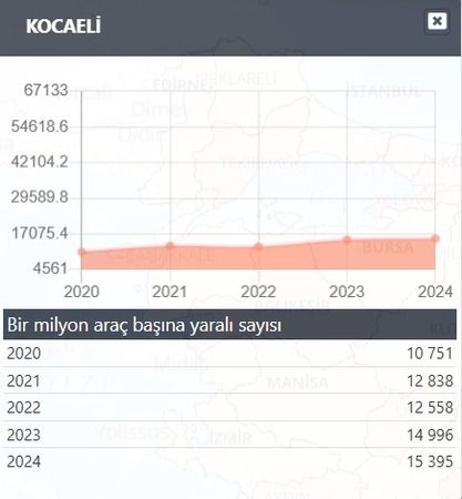 Yine TÜİK verilerine göre 1 milyon araç başına ölüm sayısı 2020 yılı verilerine göre 193, 2021 yılı verilerine göre 243 şeklinde artış gösterirken, 2022 yılında azalma göstererek 194 olarak istatistikler arasında yer aldı. 2023 yılına gelindiğinde ise 222 istatistiki bilgisiyle yeniden bir artış gözlemlenirken 2024 yılında bu veri az da olsa düşüş göstererek 219 şeklinde tabloda yer aldı. Fakat veriler gözlemlendiğinde aylık ve yıllık otomobil sayısı verilerinin sürekli bir halde artışına dikkat edildiğinde, bu azalmaların artan araç yoğunluğuna bağlı olabileceği düşünülüyor. 1 milyon araç başına yaralanma sayıları ise tabloda şu şekilde yer aldı: “2020 yılında 10 bin 751, 2021 yılında 12 bin 838, 2022 yılında 12 bin 558, 2023 yılında 14 bin 996, 2024 yılında ise 15 bin 395.