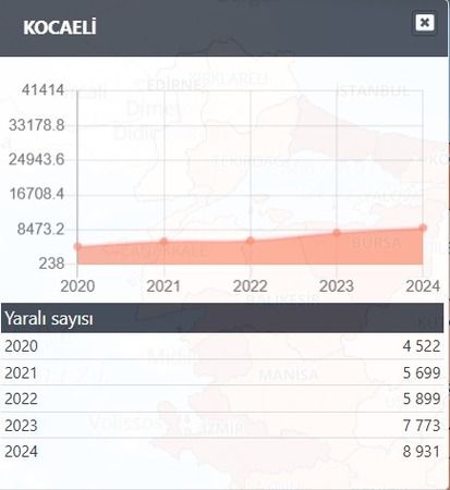 Veriler incelendiğinde kazalarda oluşan yaralanma sayıları, 2020 yılında 4 bin 522, 2021 yılında 5 bin 699, 2022 yılında 5 bin 899, 2023 yılında 7 bin 773 ve 2024 yılında 8 bin 934 şeklinde gerçekleşti. Verilere göre kazalarda yaşanan ölüm sayıları ise 2020 yılında 81, 2021 yılında 108, 2022 yılında 91, 2023 yılında 115 ve son açıklanan veri 2024 verilerine göre 127 olarak paylaşıldı.