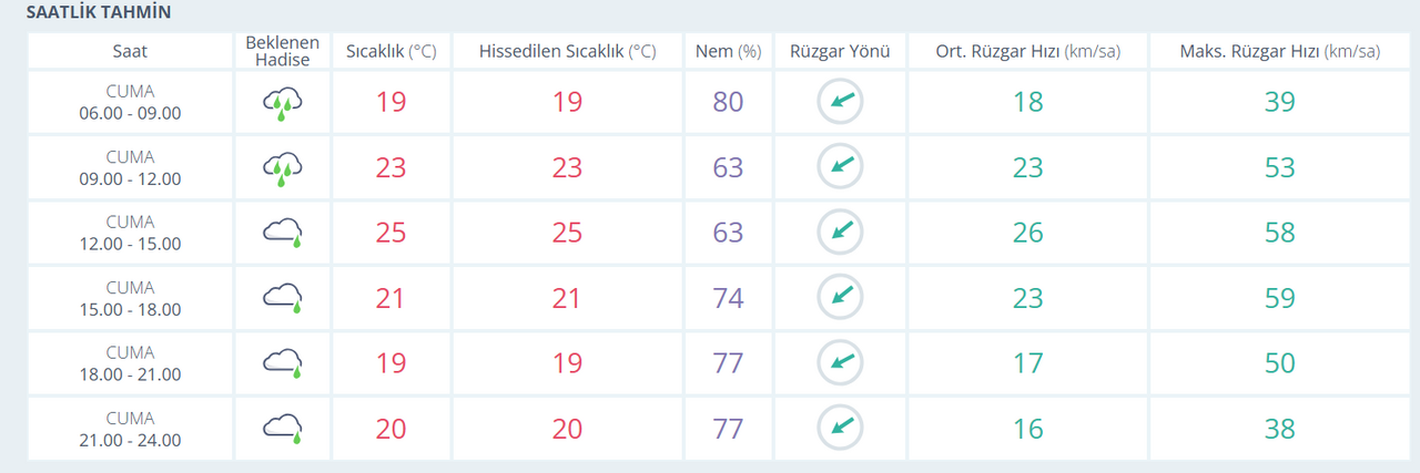 09.00 ile 15.00 saatleri arasında yağışların devam edeceği tahmin ediliyor. Sıcaklığın öğle saatlerinde 25 dereceye çıkması öngörülürken, rüzgarın saatte 58 kilometreye kadar ulaşacağı bildirildi. Nem oranı ise yüzde 63 seviyelerinde seyredecek. Meteoroloji raporuna göre akşam saatlerinde de mevzi sağanak yağışlar etkili olmaya devam edecek. 18.00’den sonra sıcaklık 19 dereceye düşerken, rüzgar 50 km/sa hıza ulaşacak. Gece yarısına doğru ise 20 derece civarında sıcaklıkla birlikte yağışların sürmesi bekleniyor.