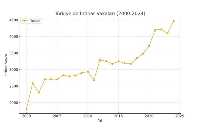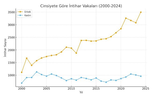 2000 yılında bin 802 intihar, bin 114’ü erkek, 688’i kadın. 2001 yılında 2 bin 584 intihar, bin 677’si erkek, 907’si kadın. 2002 yılında 2 bin 301 intihar, bin 392 erkek, 909 kadın. 2003 yılında 2 bin 705 intihar, bin 574 erkek, bin 131 kadın. 2004 yılında 2 bin 707 intihar, bin 681’i erkek, bin 26’sı kadın. 2005 yılında 2 bin 703 intihar, bin 740 erkek, 963 kadın. 2006 yılında 2 bin 829 intihar, bin 782 erkek, bin 47 kadın. 2007 yılında 2 bin 793 intihar, bin 808 erkek, 985 kadın. 2008 yılında 2 bin 816 intihar, bin 924 erkek, 892 kadın. 2009 yılında 2 bin 898 intihar, 2 bin 111 erkek, 787 kadın. 2010 yılında 2 bin 933 intihar, 2 bin 73 erkek, 860 kadın. 2011 yılında 2 bin 677 intihar, bin 876 erkek, 801 kadın. 2012 yılında 3 bin 287 intihar, 2 bin 377 erkek, 910 kadın. 2013 yılında 3 bin 252 intihar, 2 bin 382 erkek, 870 kadın. 2014 yılında 3 bin 169 intihar, 2 bin 352 erkek, 817 kadın. 2015 yılında 3 bin 246 intihar, 2 bin 358 erkek, 888 kadın. 2016 yılında 3 bin 193 intihar, 2 bin 426 erkek, 767 kadın. 2017 yılında 3 bin 168 intihar, 2 bin 445 erkek, 723 kadın. 2018 yılında 3 bin 342 kişi intihar sonucu yaşamını yitirirken, bu sayının 2 bin 529’u erkek, 813’ü ise kadın olarak belirlendi. 2019 yılında 3 bin 476 intihar, 2 bin 684 erkek, 792 kadın. 2020 yılında 3 bin 710 intihar, 2 bin 845 erkek, 865 kadın. 2021 yılında 4 bin 194 intihar, 3 bin 263 erkek, 931 kadın. 2022 yılında 4 bin 218 intihar, 3 bin 173 erkek, bin 45 kadın. 2023 yılında 4 bin 89 intihar, 3 bin 80 erkek, bin 9 kadın. 2024 yılına gelindiğinde ise 4 bin 460 intihar gerçekleşirken, bu sayının 3 bin 499’u erkek, 961’i ise kadın olarak istatistiklerde yer aldı.