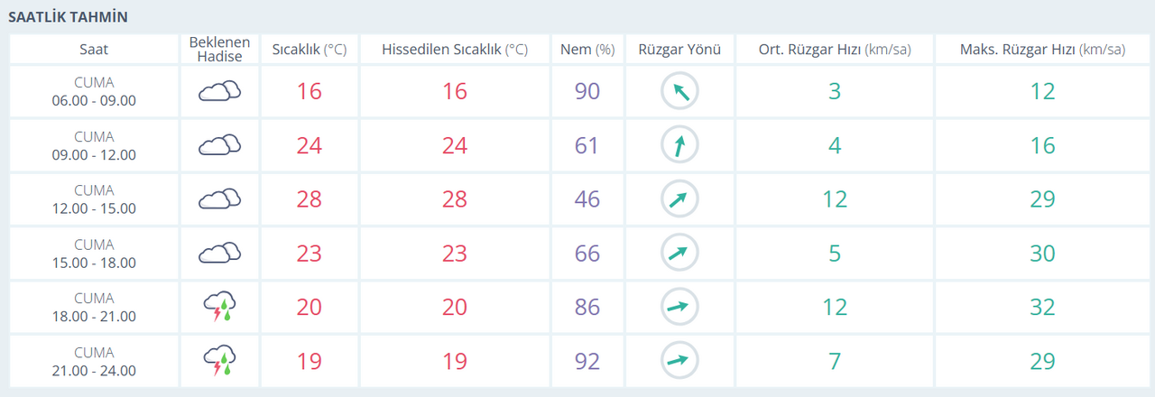 Kocaeli'de 24 Ekim Cuma günü sabah saatlerinde parçalı ve çok bulutlu bir hava etkili olurken, günün ilerleyen saatlerinde hava sıcaklığı 28°C'ye kadar yükselecek. Ancak akşam saatlerine girildiğinde gök gürültülü sağanak yağış bekleniyor. Meteoroloji raporlarına göre sabah 09.00'a kadar sıcaklık 16°C, nem oranı ise %90 seviyelerinde seyredecek. Öğle saatlerinde sıcaklık 28°C’ye ulaşacak. 18.00 sonrası ise ani hava değişimiyle birlikte gökgürültülü sağanak yağış Kocaeli genelini etkisi altına alacak. Öğleden sonra rüzgar hızının 29-30 km/sa'ya kadar çıkması bekleniyor. Akşam saatlerinde ise rüzgarın yön değiştirmesiyle birlikte maksimum 32 km/sa hıza ulaşacağı öngörülüyor.