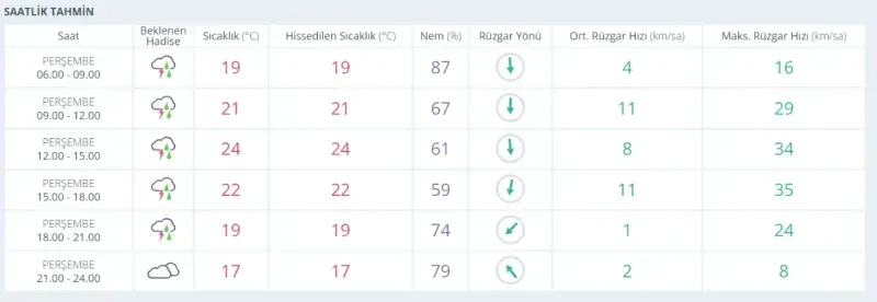 Sabah 06.00 ile 12.00 saatleri arasında sıcaklık 19-21 derece arasında seyrederken gök gürültülü sağanak etkili olacak. Öğle saatlerinden itibaren sıcaklık 24 dereceye yükselirken yağış devam edecek.