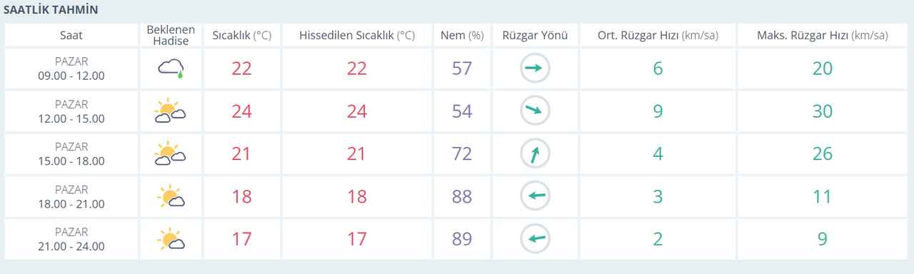 Meteoroloji’nin saatlik tahminlerine göre sabah 09.00-12.00 saatleri arasında mevzi sağanak yağışlar bekleniyor. Öğle saatlerinde (12.00-15.00) havanın parçalı bulutlu olacağı, sıcaklığın 24 dereceye ulaşacağı tahmin ediliyor. Günün ilerleyen saatlerinde sıcaklıkların kademeli olarak düşeceği, akşam 18.00 itibarıyla 18 dereceye kadar ineceği belirtildi. Akşam saatlerinde az bulutlu hava hakim olacak. Nem oranı yüzde 88–89 seviyelerinde seyrederken, rüzgarın zaman zaman 9–11 km/sa hızla eseceği öngörülüyor.