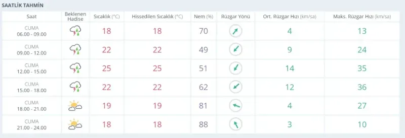 Günün farklı saatlerinde rüzgâr zaman zaman 35 km/sa hıza ulaşırken, Meteoroloji Genel Müdürlüğü tahminlerine göre yağış gerçekleşecek. Akşam saatlerinde hava yeniden parçalı bulutlu seyrederken sıcaklık 18 dereceye kadar düşecek.