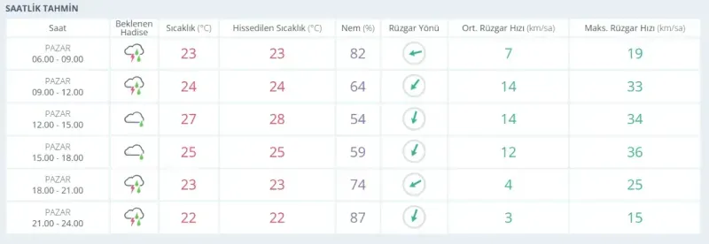 Meteoroloji verilerine göre sabah 06.00’dan itibaren başlayan gökgürültülü sağanak, öğle saatlerine kadar etkisini sürdürecek. Öğleden sonra ise yer yer mevzi sağanak geçişleri yaşanacak. Akşam saatlerinde tekrar gökgürültülü yağışlar etkili olacak. Rüzgarlar zaman zaman saatte 36 km hıza ulaşacak.