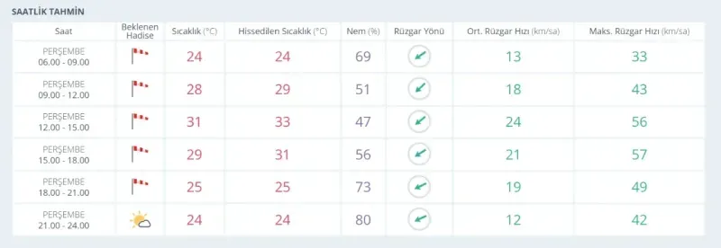 12.00 - 15.00: Günün en sıcak saatleri! Rüzgarlı, 31°C (hissedilen 33°C), nem %47, rüzgar hızı 24 km/sa (maks. 56 km/sa)