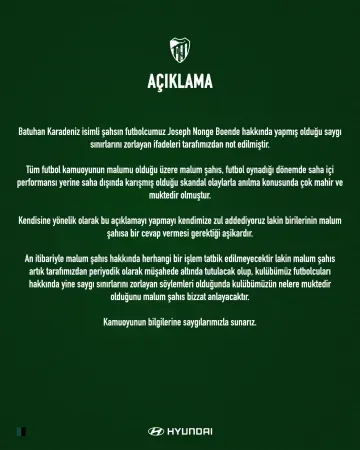 “Batuhan Karadeniz isimli şahsın futbolcumuz Joseph Nonge Boende hakkında yapmış olduğu saygı sınırlarını zorlayan ifadeleri tarafımızdan not edilmiştir. Tüm futbol kamuoyunun malumu olduğu üzere malum şahıs, futbol oynadığı dönemde saha içi performansı yerine saha dışında karışmış olduğu skandal olaylarla anılma konusunda çok mahir ve muktedir olmuştur. Kendisine yönelik bu açıklamayı yapmayı kendimize zul addediyoruz; lakin birilerinin cevap vermesi gerektiği aşikârdır.”