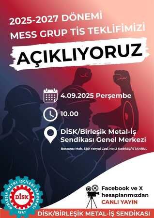 Metal işkolunda on binlerce işçiyi doğrudan ilgilendiren 2025–2027 dönemi MESS Grup Toplu İş Sözleşmesi süreci için kritik gün yarın. Sendikalar, taleplerini kamuoyuna arka arkaya duyuracak.