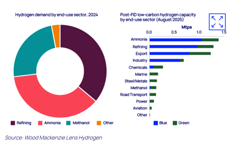 Küresel olarak rafinaj, amonyak ve metanol, geleneksel karbon yoğun hidrojen tüketiminin yılda yaklaşık 100 milyon tonunu oluşturmaktadır. Bu, tüm hidrojen talebinin %98'ine eşittir.