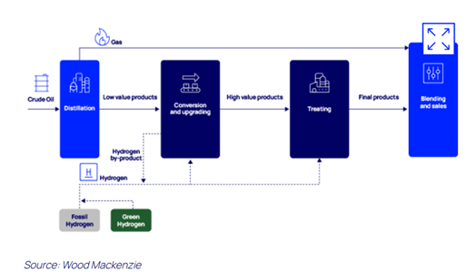 Hidrojen, ham petrolün ulaşım yakıtları ve petrokimyasal ham maddelere kimyasal dönüşümü ve geliştirilmesinde ana bir bileşendir. Ayrıca, sülfürsüz yakıtlar için gerekli olan yol yakıtlarından kirleticilerin bertaraf edilmesinde de kullanılmaktadır. Hidrojen, nafta ile benzine dönüşümünün de bir yan ürünüdür. Ancak üretilen hacimler rafinerilerin kendi ihtiyaçlarını karşılamak için yetersizdir, bu nedenle buhar metan reformasyonu ile ek hidrojen üretimi esastır.