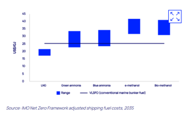 Uluslararası Denizcilik Örgütü'nün (IMO) Nisan 2025'te yayınlanan Net Sıfır Çerçevesi, küresel ilgiyi artırmaktadır. Bu çerçeve, küresel sera gazı yakıt yoğunluğu hedefleri ve bir kredi ticareti sistemi getirmekte olup, uzun vadede 80 Mtpa'dan fazla hidrojen türevi yakıtın kullanılmasına olanak tanıyan bir fon içermektedir. Ancak, mevcut IMO fiyatlandırma mekanizması altında, hidrojen bazlı yakıtların mevcut yakıtlarla rekabet edebilmesi zaman alacaktır ve fuel oil'i daha hızlı bir şekilde yerinden etmek için ek cezalar veya ödüller gerekecektir.