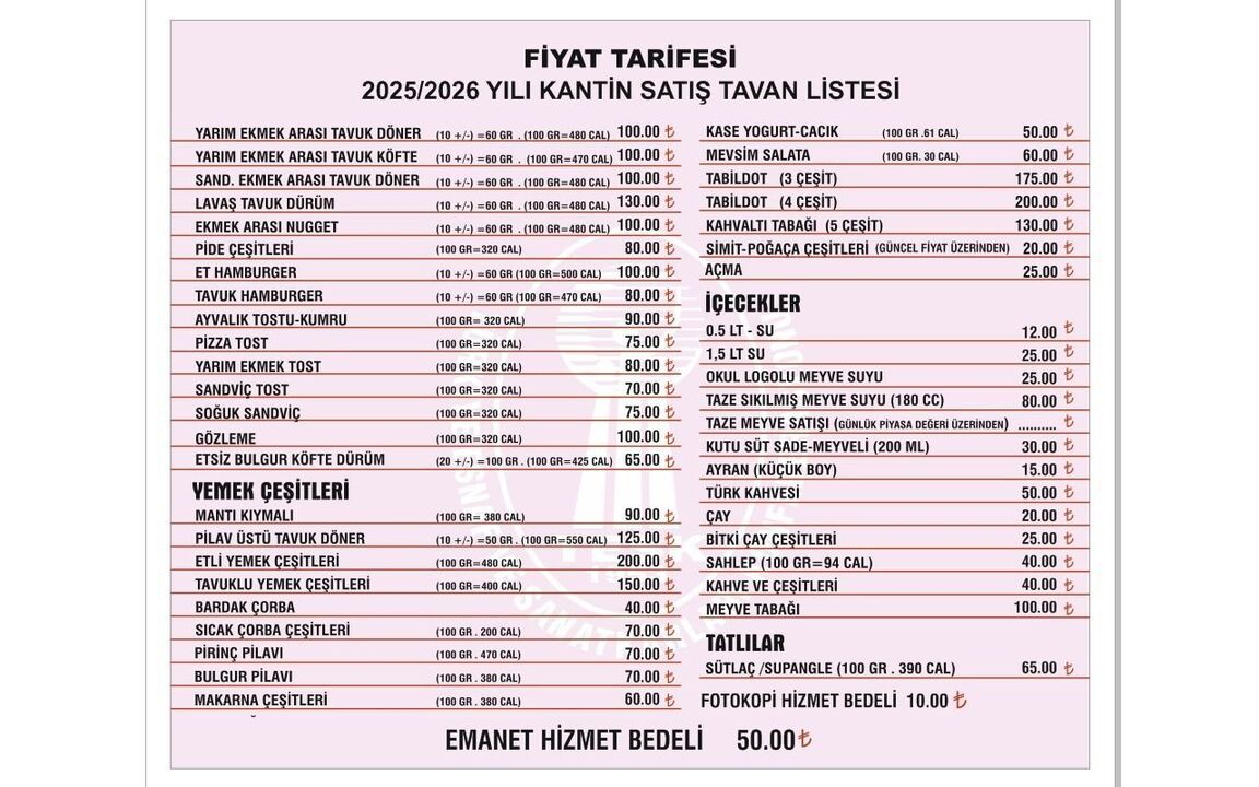 BAKKALLAR ODASININ AÇIKLADIĞI 2025/2026 YILI KANTİN SATIŞ TAVAN LİSTESİ