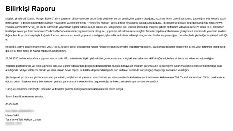 Türkiye'nin önde gelen haber yazılım firmaları arasında dikkat çeken bir dava gündeme geldi. Prodestek Bilişim tarafından geliştirilen "Daktilo Manşet Editörü" yazılımının, rakip şirket TE Bilişim tarafından "Nova" isimli yazılım içinde "Photoshop Manşet" adıyla kopyalandığı iddiası üzerine taraflar mahkemelik oldu. Küçükçekmece Cumhuriyet Başsavcılığı dosyasına giren bilirkişi raporunda, iki programın kullanıcı arayüzlerinin birbirine benzer olduğu sonucuna varıldı.