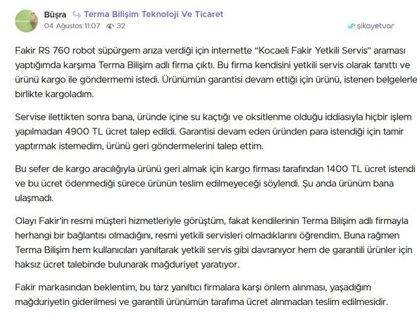 Arama sonucunda karşısına çıkan ve kendisini yetkili servis olarak tanıtan Terma Bilişim adlı firmaya ürünü gönderdi. Ancak bu firma ne Fakir’in resmi servisiydi ne de ürüne garanti kapsamında işlem yaptı.