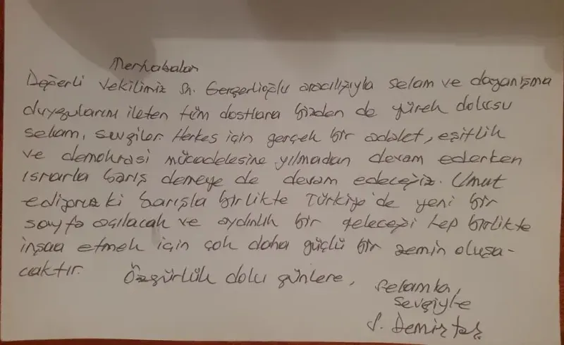 Demirtaş, kendisini ziyaret eden DEM Parti Milletvekili Ömer Faruk Gergerlioğlu aracılığıyla, "Merhabalar Değerli vekilimiz Sayın Gergerlioğlu aracılığıyla selam ve dayanışma duygularını ileten tüm dostlara bizden de yürek dolusu selam, sevgiler." mesajını paylaştı.