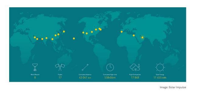 Solar Impulse 2'nin 17 etaptan oluşan yolculuğunda tamamladığı etaplar:
